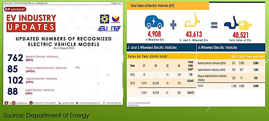Actual sales of 4-wheeled EVs almost tripled in 2024 to 3,880 units from 1,028 units sold in 2023—a 277.5% spike, based on EV stakeholders’ submission compiled and released by the Department of Energy (DOE) and EVAP. Of the three categories of EVs, battery electric vehicles (BEVs) accounted for about 75%, while hybrid electric vehicles (HEVs) comprised about 23% and plug-in hybrid vehicles (PHEVs) was at about 2%.