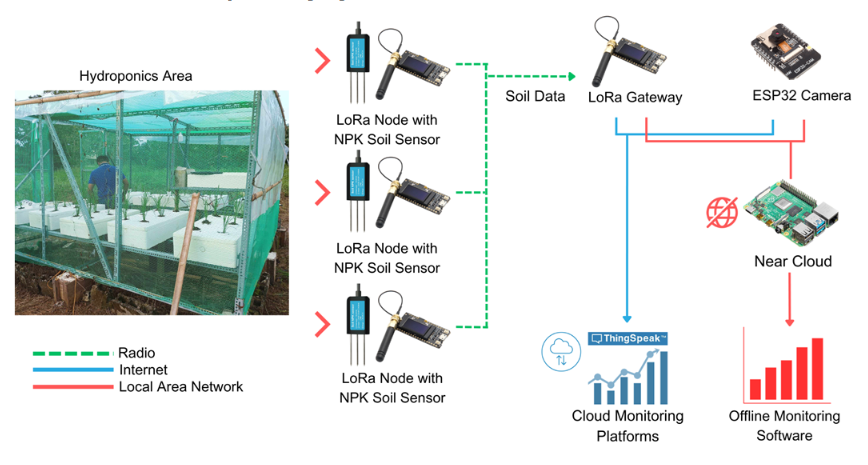 LoRa technology, known for its long-range communication capabilities, is utilized to transmit the collected data by the sensors. This technology utilizes radio waves, enabling the transmission of data over long distances, making it highly suitable for agricultural applications, even in remote areas. The data can be transmitted locally through LoRa technology to a NearCloud Raspberry Pi server for offline real-time monitoring and analysis. This real-time data analysis is crucial for immediate decision-making and adjustments in the farming process.