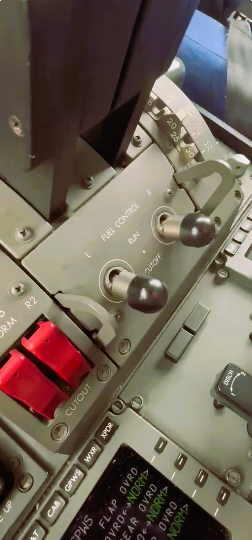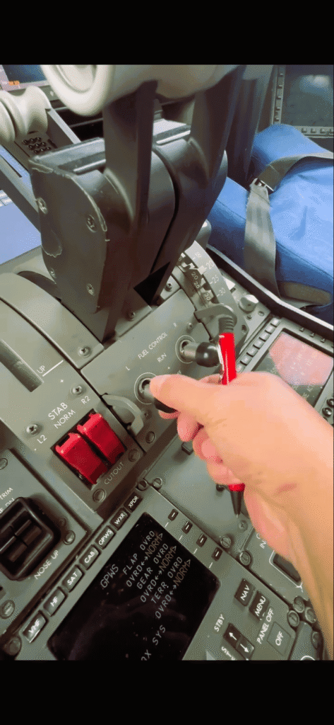 This series of screengrabs of a video taken during an aircraft engineer’s pre-flight check of a Boeing 787 Dreamliner shows the two fuel control switches labeled “run” (switch on) and “cut off” (switch off). The engineer demonstrates that pulling up the switch is needed in order to run the fuel control. Pulling up the lever is again needed to move the switch to the cut-off position.