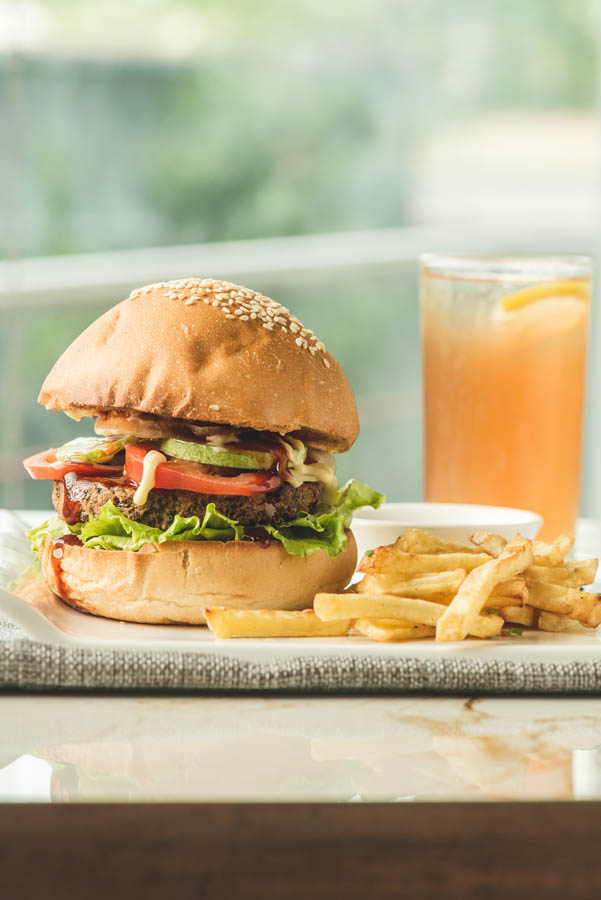 Lun-haw Vegan Café’s Vegan Burger (Cebu City), made with mung beans and potato, paired with a vegan sauce and all the trimmings, and served with a side of air-fried fries