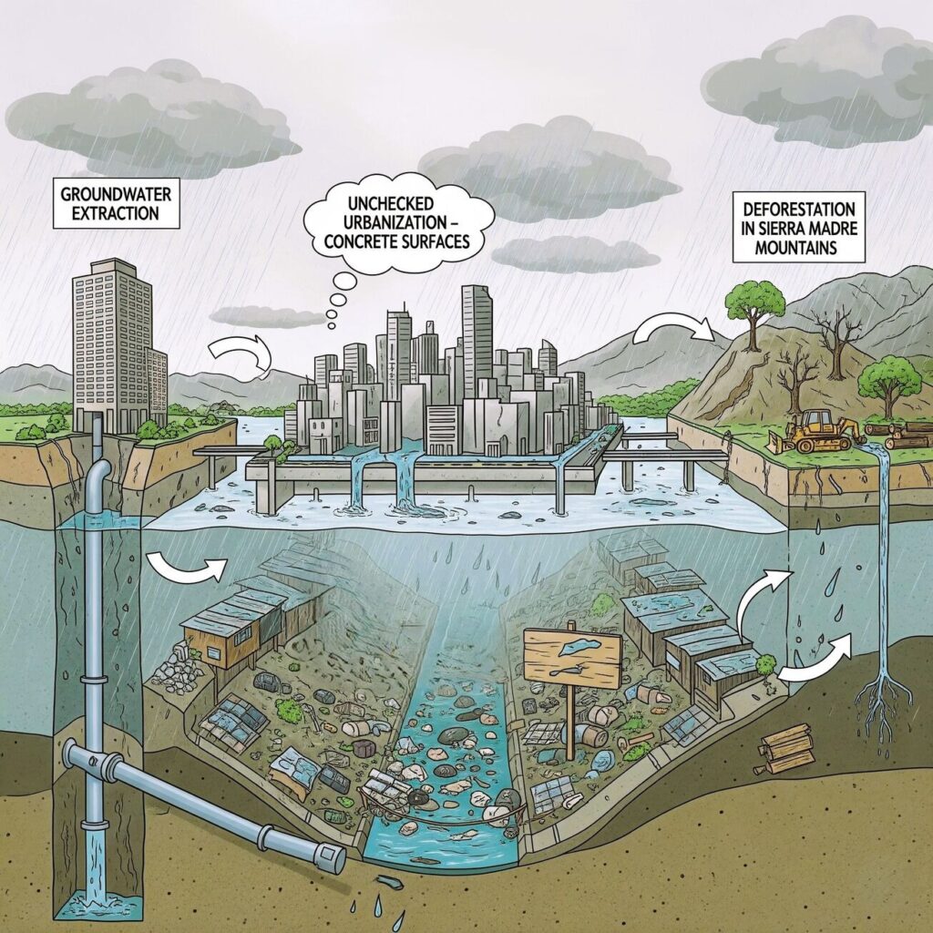 According to Greg Bankoff in his article “Flooding in Metro Manila: a historical perspective” in the International Institute for Asian Studies Newsletter (2003), one of those causes is unregulated groundwater extraction, causing the city to sink at an alarming rate, which in turn makes it more susceptible to floods. A relentless wave of unchecked urbanization has paved over natural drainage surfaces, replacing them with impervious concrete that transforms rainfall into overwhelming runoff. The city’s vital waterways—its natural and engineered arteries—are systematically choked by a solid waste management crisis of staggering proportions and constricted by the encroachment of informal settlements and other structures. Looking upstream, the critical watersheds of the Sierra Madre mountains, which once served as the region’s natural shield, have been dangerously eroded by deforestation, unleashing faster and larger volumes of water into the downstream metropolis.