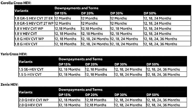 Customers can now enjoy 0% interest for financing options on select hybrid electric vehicle (HEV) models, including the Corolla Cross, Yaris Cross, and Zenix with flexible down payment options ranging from 15% to 50% and payment periods of up to 36 months, depending on the following HEV variants below: