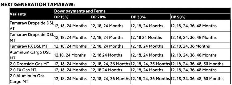 Additionally, customers can also enjoy 0% interest for financing options of selected variants of the Next Generation Tamaraw, also with flexible down payment options ranging from 15% to 50% and payment periods of up to 48 months.