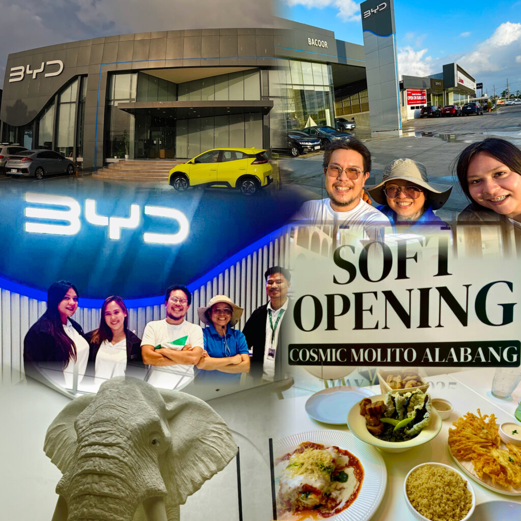 Top composite photo shows Day One action at BYD Bacoor and Cosmic vegan restaurant in Alabang
