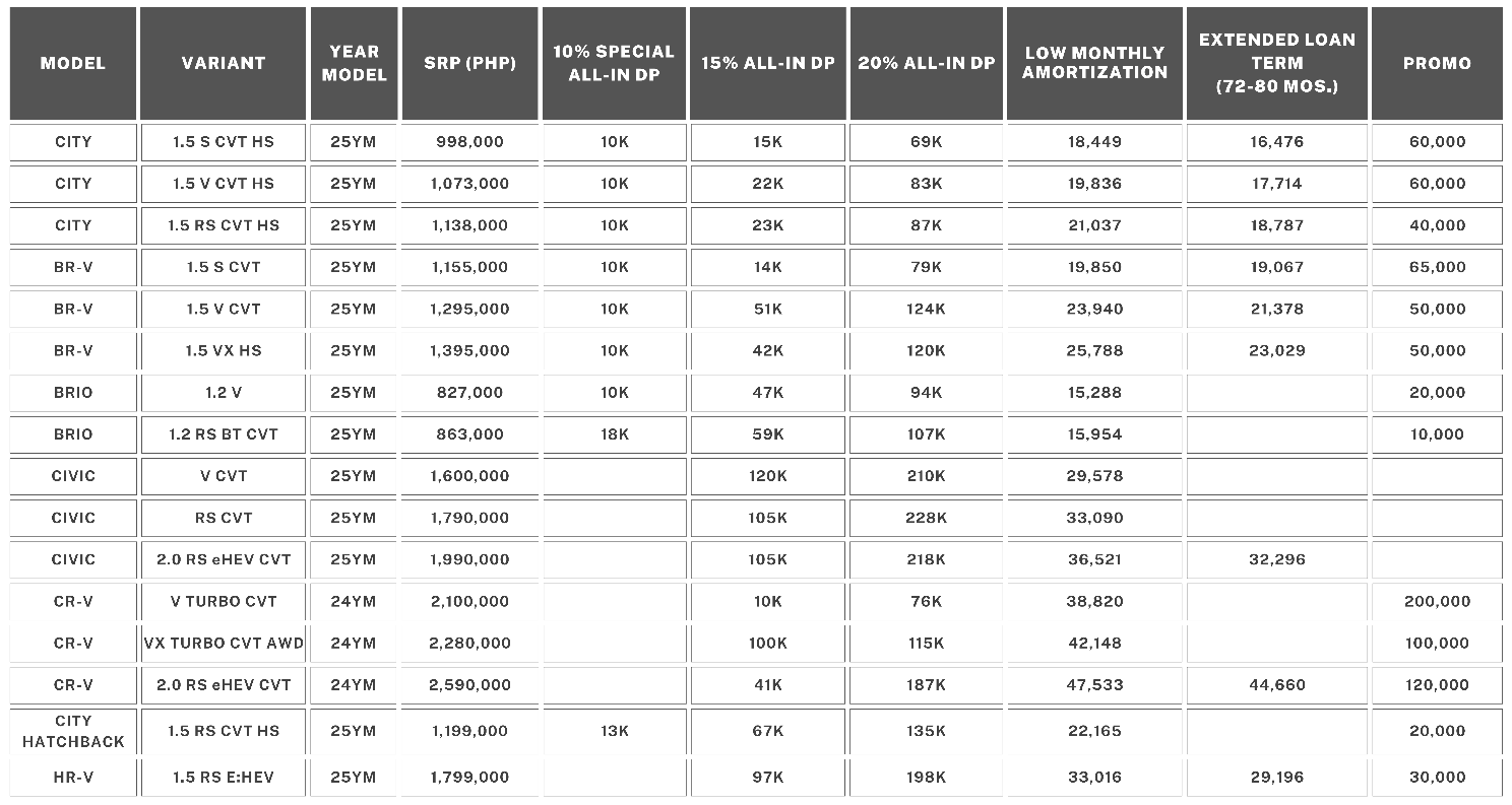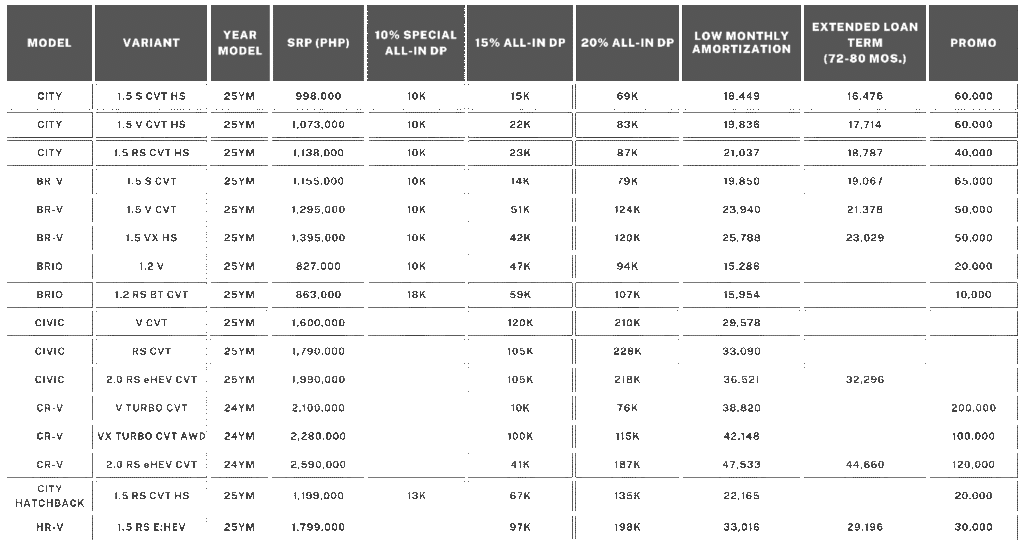 2. Low cash-out and low monthly amortization all-in bundle applicable for current e:HEV models: Customers are entitled to 15% or 20% downpayment with 60 months to pay. 15% downpayment is not applicable to PSBank.