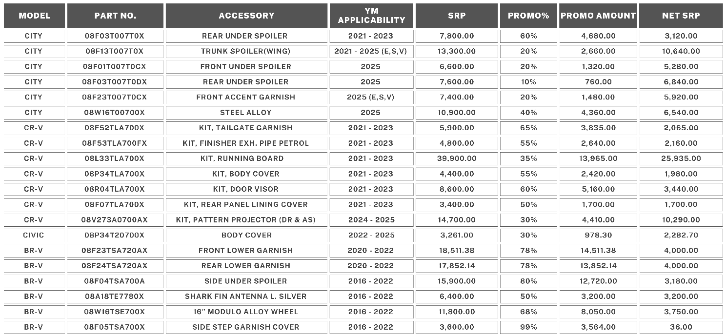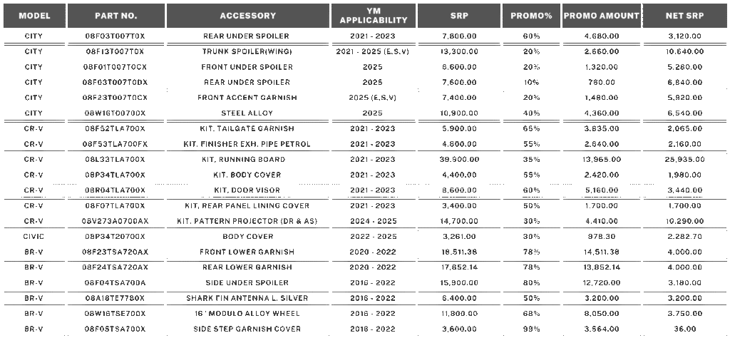 There is no better way to make a Honda car stand out than with Honda Genuine Accessories. Save up to P14,500 this month on various accessories listed below.