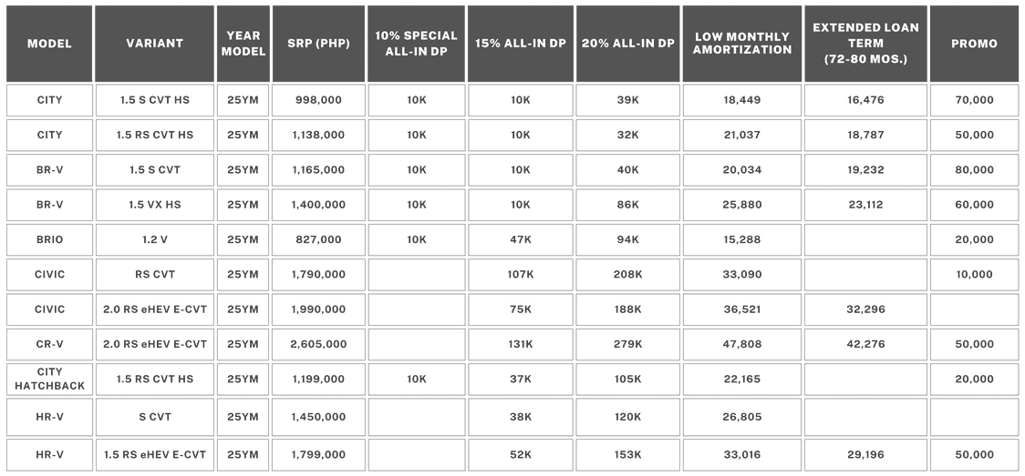 2. Low cash-out and low monthly amortization all-in bundle applicable for current e:HEV models: Customers are entitled to 15% or 20% downpayment with 60 months to pay. Fifteen (15%) downpayment is not applicable to PSBank.