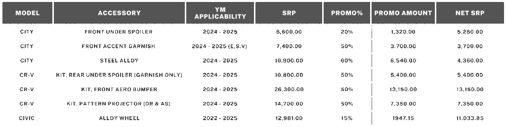 The best way to spruce up a Honda Car is with Honda Genuine Accessories. Customers may save up to P13,150 on various accessories this month.