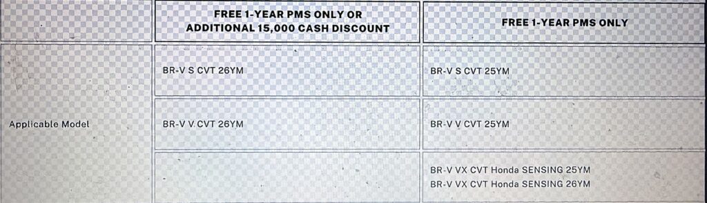 On top of these special promos for the BR-V, customers can enjoy free 1-year periodic maintenance service (PMS) or an additional P15,000 cash discount, depending on the BR-V unit purchased: