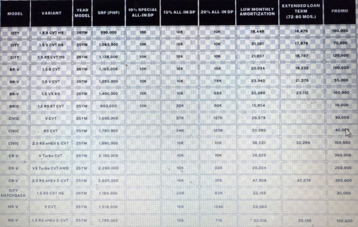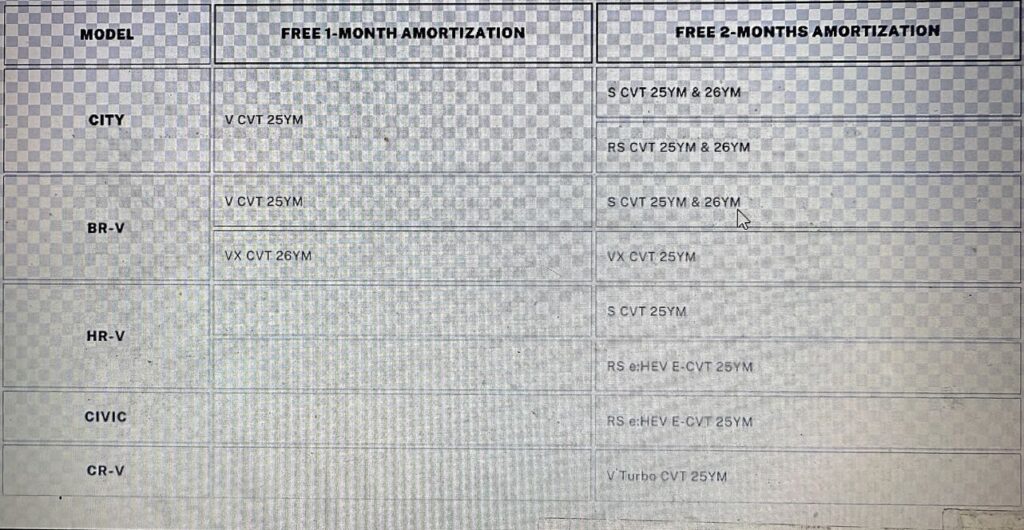Continuously offering flexible ways to own a Honda, HCPI extends its Drive Today, Pay Later until March 31, 2026. This promotion allows customers to avail up to 2 months of free amortization through participating bank partners—BPI and RCBC. This offer is inclusive of the all-in package (1-year comprehensive insurance, 3-year LTO registration, and Personal Property Securities Register or PPSR fee) and applicable only through 15% or 20% all-in low cash-out financing scheme of over 5 years or 60 months.