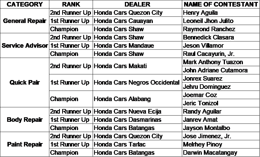 The NSC took place at the recently inaugurated training center of the HCPI Sta. Rosa office. This competition was spearheaded by the car brand for dealer technicians and service advisors, where the top three in each category were determined and awarded.