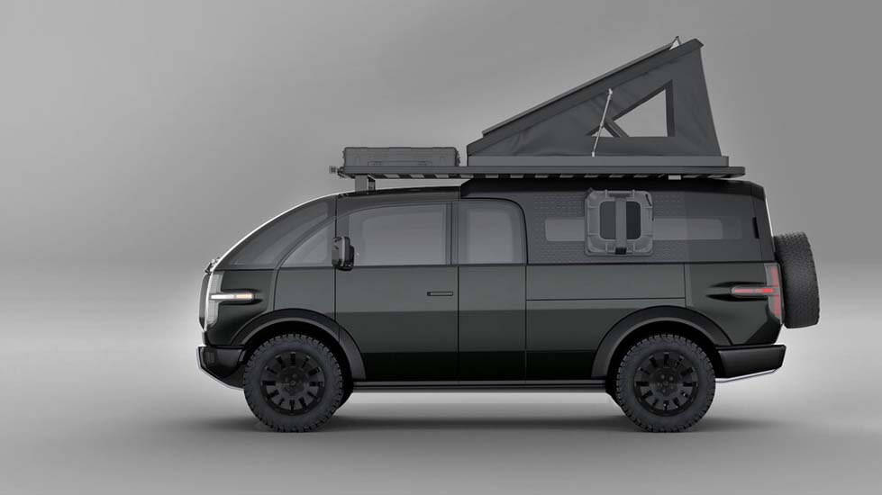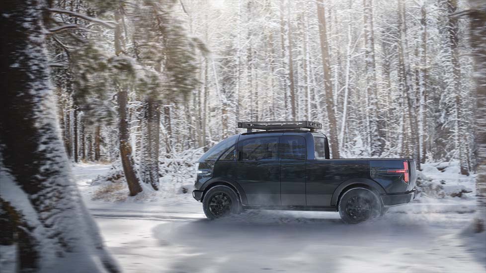 Canoo’s new electric pickup is powered by dual or rear motor configurations with up to 600 hp and 746 Nm of maximum torque (dual motors). The battery range is at over 200 miles (320 kms) with a vehicle payload capacity of 1800 pounds. The platform will utilize steer-by-wire and brake-by-wire technology with a tow hitch receiver.