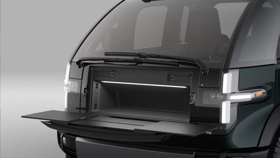 The pickup truck can double as a powerplant with exportable power accessible on all sides of the vehicle. Power can last all day for tools and devices, with as little as 10% impact on vehicle range. The third brake light doubles as an overhead light to see inside the cargo bed at night. The vehicle is also equipped with perimeter lighting on all sides of the bed wall for added visibility. Optional roof racks in variable sizes for added cargo storage are also available. The roof rack is easily accessible from the flatbed or via the sidestep. The pickup truck has been designed to accommodate various camper shells to fit as many use cases as possible.