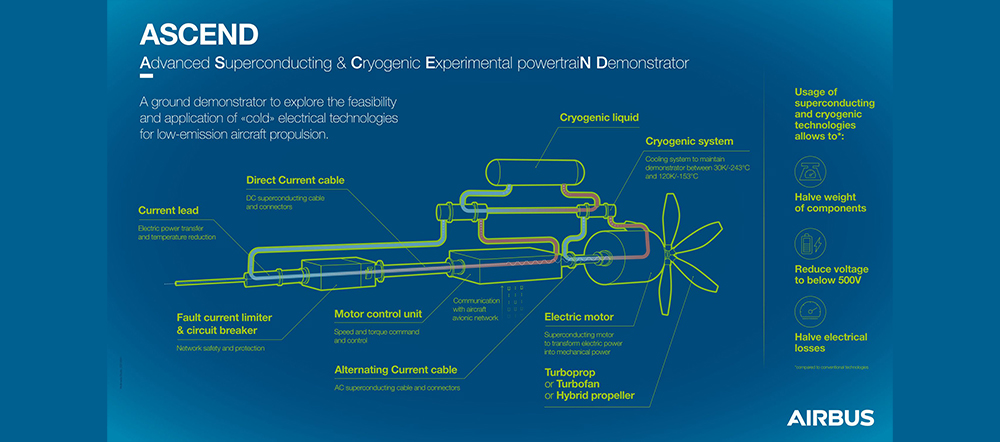 Airbus will use Ascend to explore these promising technologies’ feasibility to optimize propulsion architecture ready for low-emission and zero-emission flight. Results are expected to show the potential for component weight and electrical losses to be at least halved as the volume and complexity of systems installation are reduced—a reduction in voltage to below 500V compared to current systems. Ascend will assess electric architectures from several hundred kilowatts to multi-megawatt applications with and without liquid hydrogen on board.