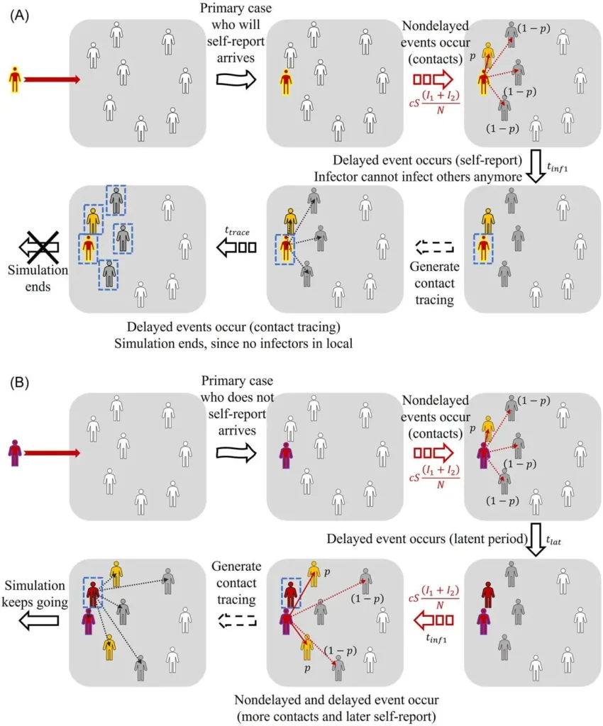In this manner, their algorithm considered random fluctuations in human behavior and subsequent delayed contact tracing. They then set up 8 scenarios for their study, running 100,000 simulations in each to better understand the significance and impact of the primary case’s self-reporting or lack thereof.