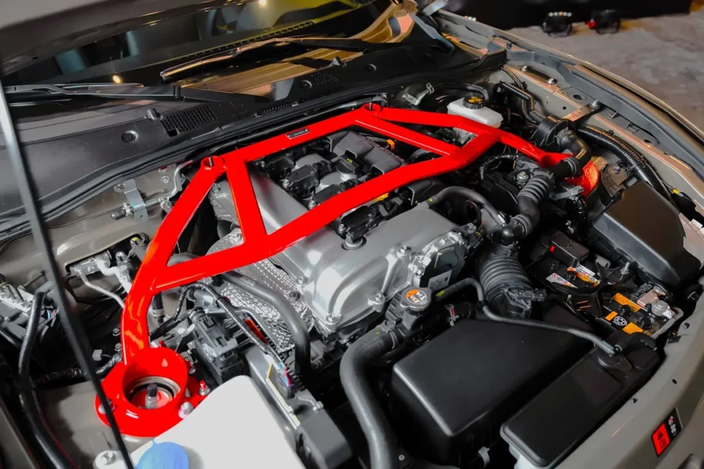 The AutoExe tower brace set is an evolved tower bar thanks to its three-dimensional structure. Its layout allows energy to be distributed evenly while doubling the rigidity of the front and rear suspension. This results in increased agility and steering response. Meanwhile, the member brace set is an advanced version of a lower arm bar. Whereas a typical lower arm bar only directly connects the left and right sides, the AutoExe member brace set covers a wider area and effectively suppresses the twisting motion of the body.