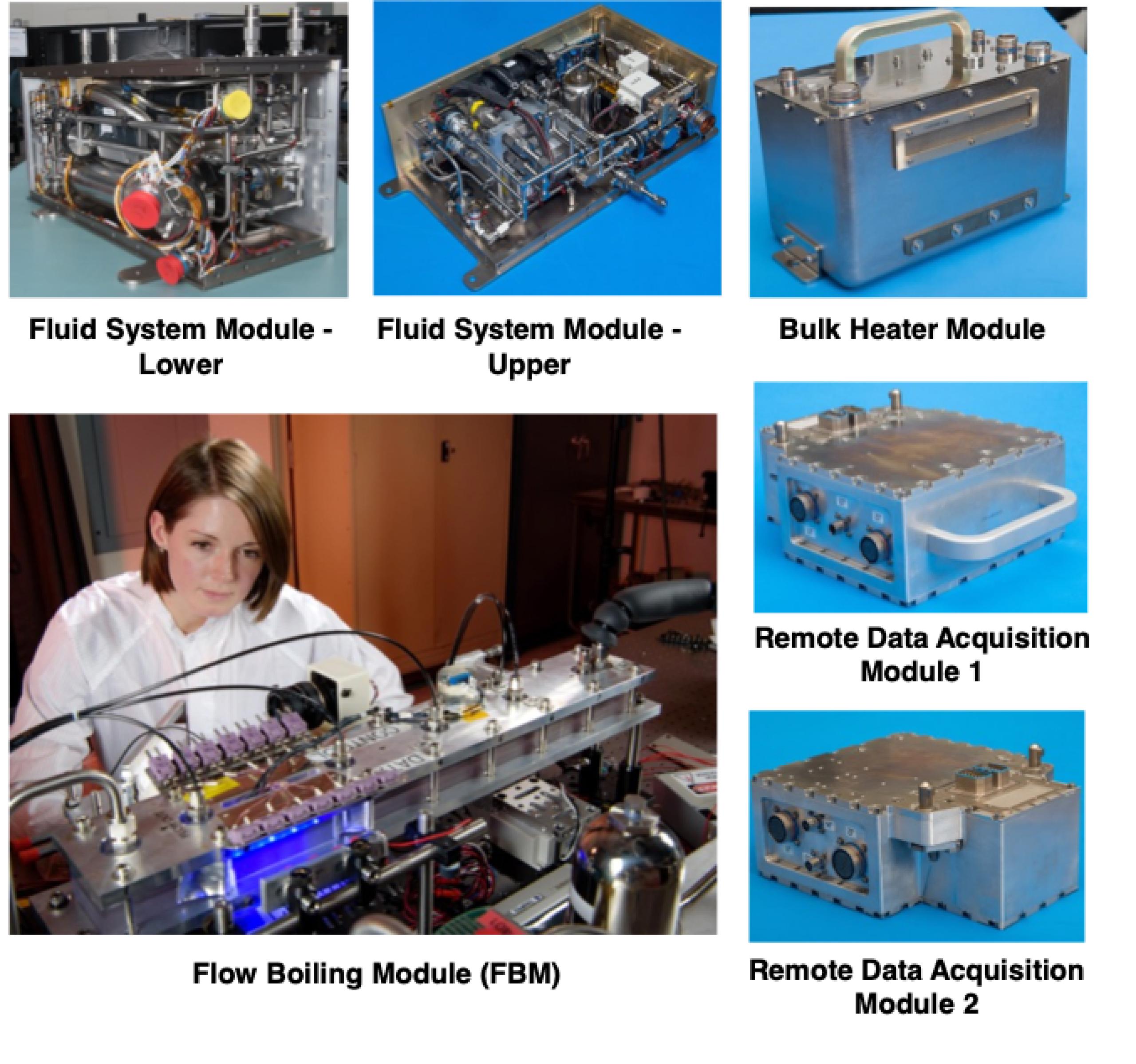 The FCBE’s Flow Boiling Module includes heat-generating devices mounted along the walls of a flow channel into which coolant is supplied in a liquid state. As these devices heat up, the temperature of the liquid in the channel increases, and eventually, the liquid adjacent to the walls starts to boil. The boiling liquid forms small bubbles at the walls that depart from the walls at high frequency, constantly drawing liquid from the inner region of the channel toward the channel walls. This process efficiently transfers heat by taking advantage of the liquid’s lower temperature and the change of phase from liquid to vapor. This process is greatly enhanced when the liquid supplied to the channel is in a subcooled state (well below the boiling point). This new “subcooled flow boiling” technique results in significantly improved heat transfer effectiveness compared to other approaches and could be used to control the temperatures of future systems in space.
