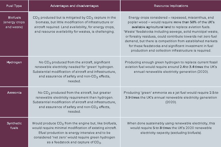 What are the options for net zero aviation fuels? The report looks at four alternative fuels: hydrogen, ammonia, synthetic fuels (eFuels), and biofuels, and examines each option against: