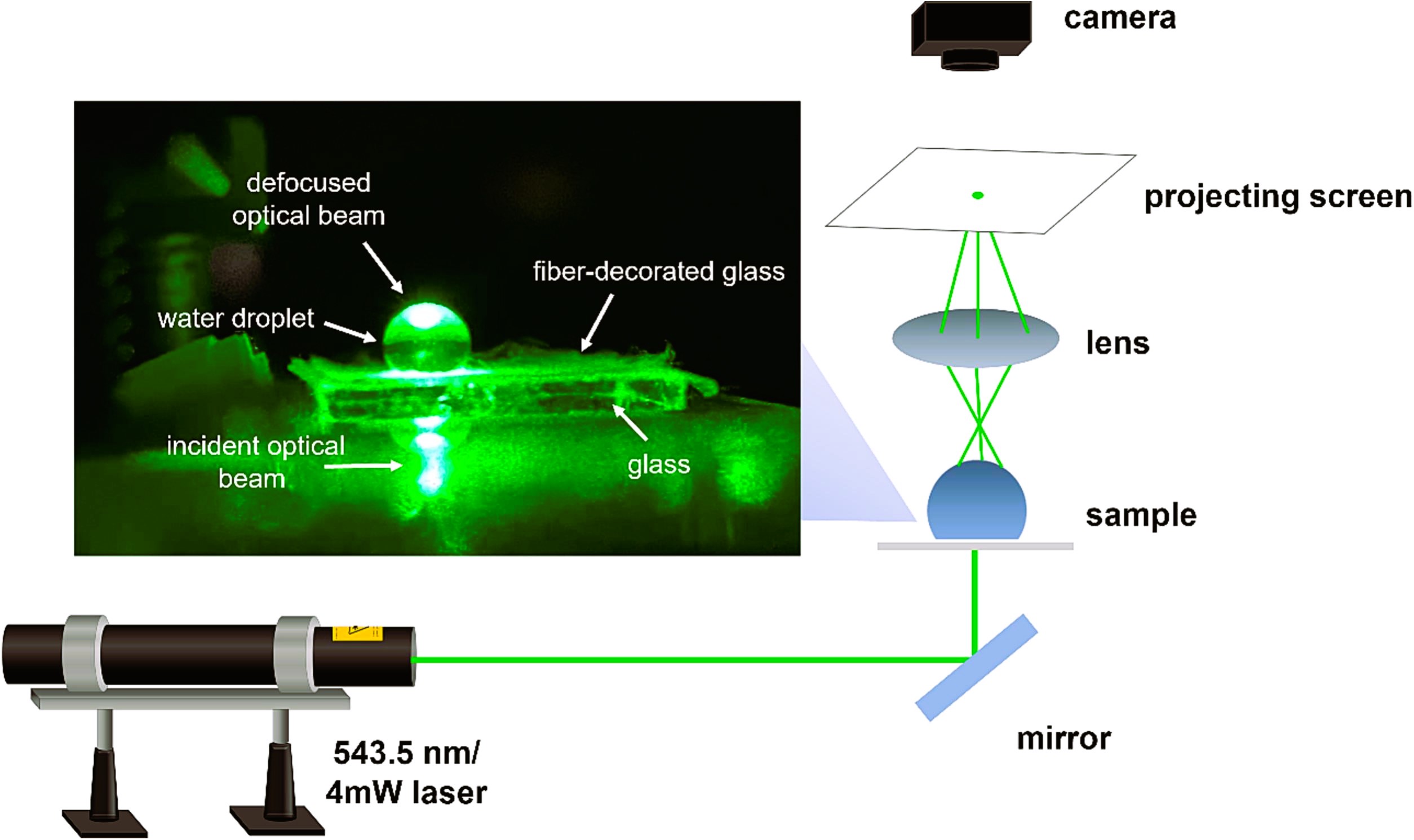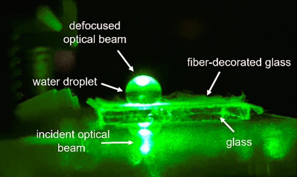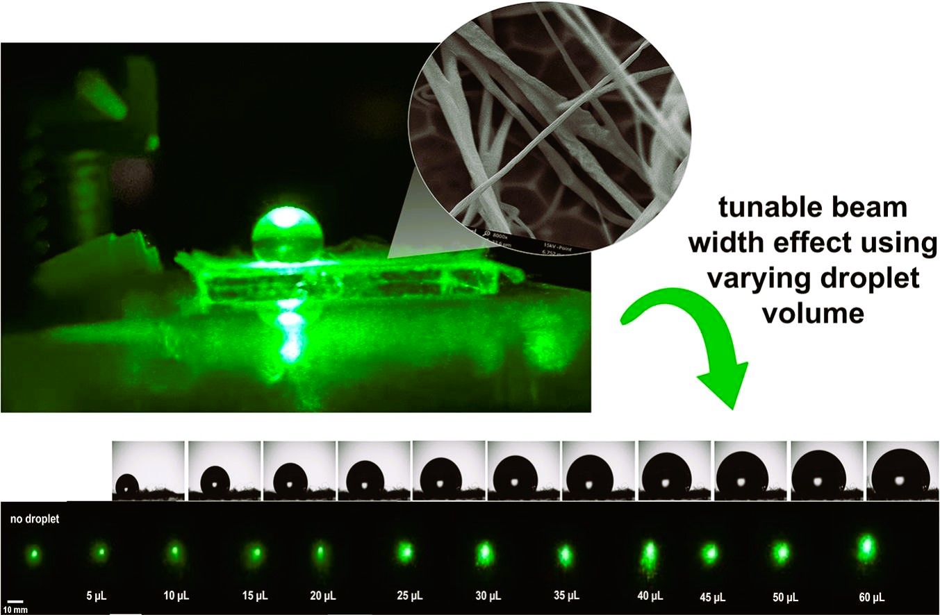In a process called “electrospinning,” the researchers melted the PVC in an electric field, which stretches out and deposits the plastic onto the glass slide as very fine microfibers. This makes the surface of the slide more water repellent, and the result is that water droplets stay in a spherical dome shape instead of flattening out. By placing droplets of different sizes on this surface and shining a laser through them, the researchers observed that the light beam widened or narrowed depending on the droplet’s size. Larger droplets acted like lenses with longer focal lengths, while smaller droplets behaved like close-up lenses, with the laser maintaining a clean and undistorted beam.