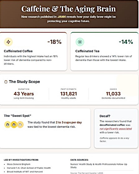 The Harvard Gazette reported that among the participants, individuals who drank the most caffeinated coffee had about an 18% lower risk of dementia compared to low or non‑drinkers. For tea drinkers, those with the highest intake had a 14% lower risk than those who drank the least.