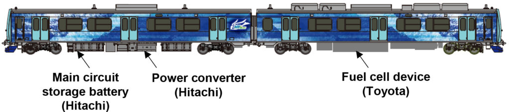 The hydrogen used to fill the hydrogen tank is supplied to the fuel cell device and undergoes a chemical reaction with oxygen in the air to generate electricity. The main circuit storage battery is charged by electric power from the fuel cell device and by capturing and converting energy to electric power using regenerative braking. The hybrid drive system supplies the electric power to the traction motors from both the fuel cell device and the main circuit storage battery, controlling the movement of the wheels. Toyota will develop the fuel cell device, and Hitachi will develop the hybrid drive system.